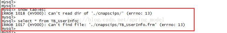 可以进入MySQL数据库,但是无法读取数据库表,报错如下:访问数据库,莫名其妙的报1018错误:ERROR 1018 (HY000): Can't read dir of './cnapscips/' (errno: 13)。