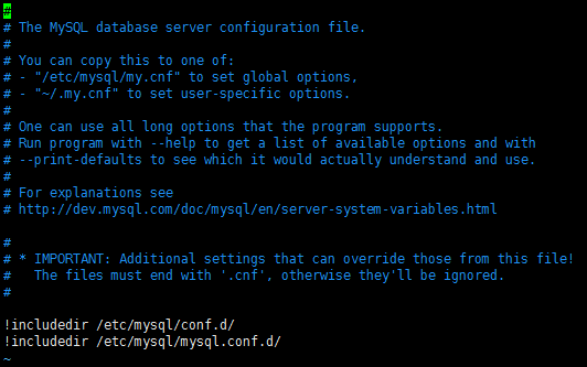 原来的配置文件变成了包含目录结构,于是在上面提到的两个目录里找找,很快就能找到配置文件原来是:/etc/mysql/mysql.conf.d/mysqld.cnf