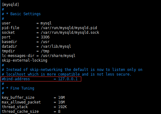 添加'#'注释掉其中的"bind-address = 127.0.0.1",如下图: