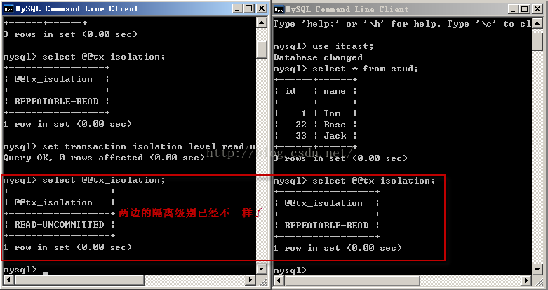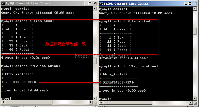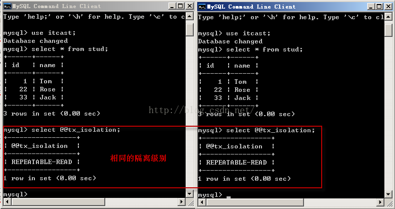 2、在A、B两端执行select @@tx_isolation;检查当前默认的隔离级别别,可以发现都是