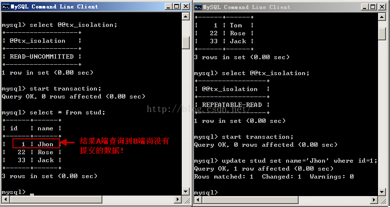 再在A端进行查询,结果发现数据又回到了之前的数据。这就是脏读: