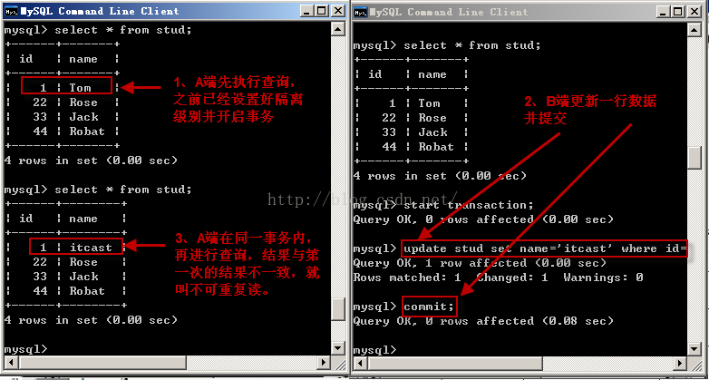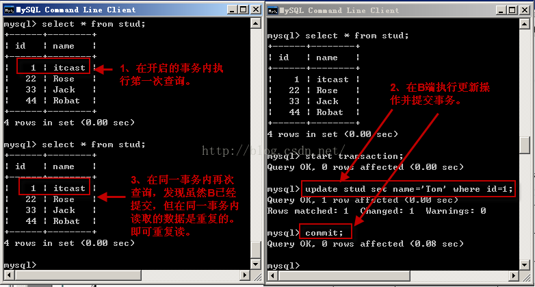 再回到A端进行查询,发现在同一个事务内,两次查询的结果不一样:
