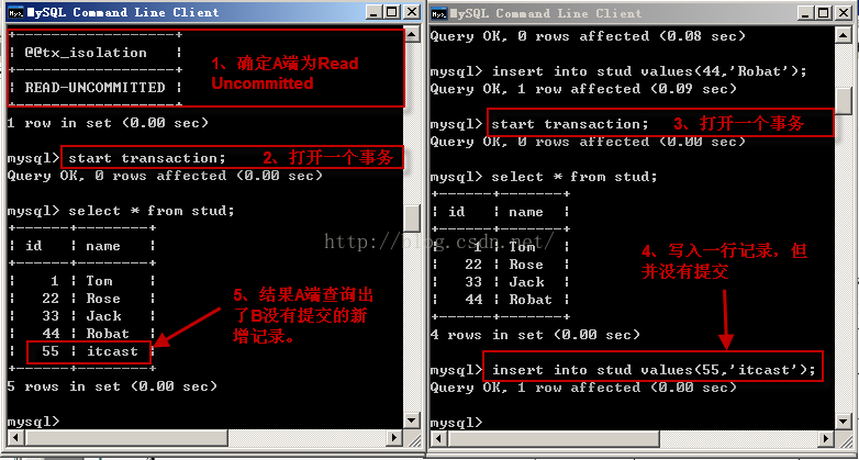 3、修改A端的隔离级别为readuncommitted –读未提交。意思是可以读取别人没有提交的数据。