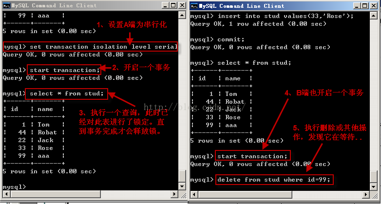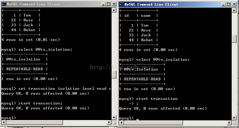 1、打开两个MySql的命令提示行,均进入相同数据库,并检查当前表内容为相同数据如下: