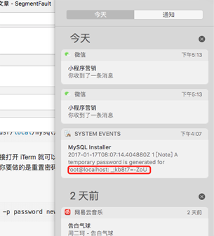 原来5.7的版本不会再给root用户分配默认密码,而是会给一个临时密码,如果你细心的话,安装mysql成功后会弹出一个临时密码让你保存。如果你没有保存,没关系,右侧的通知栏里会有,如图: