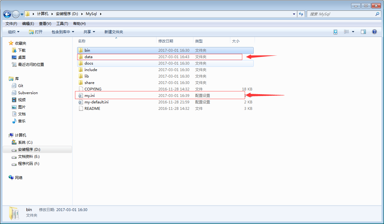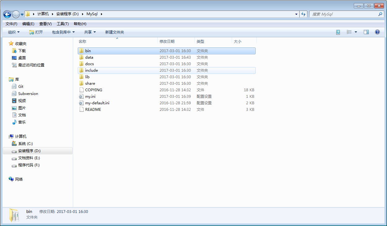 2.下载完成后将其解压到你想要安装的路径下,例如我的解压到D:\MySql路径下,刚解压完应该是下图这些文件夹: