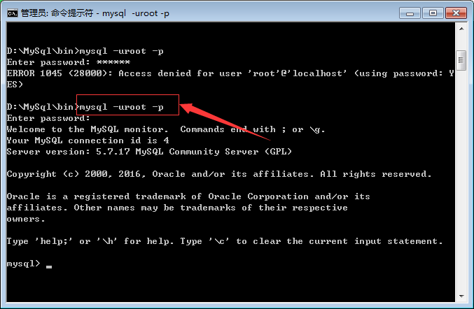8.打开 MySQL,打开 cmd.exe,输入 mysql -uroot -p 命令,默认是没有密码的,回车进入。如果有的已经设置密码了,所以要输入密码才能进。有密码的话,可以mysql -uroot -p密码,也是可以是mysql -uroot -p 回车输入密码,推荐第二种。