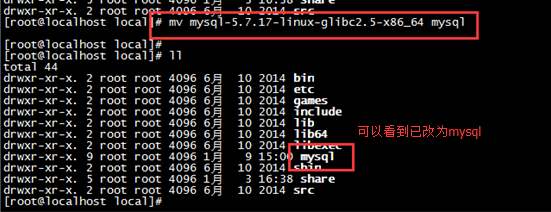 输入命令: mv mysql-5.7.17-linux-glibc2.5-x86_64 mysql