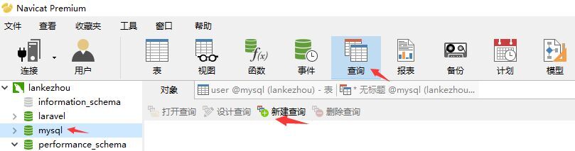 3、双击mysql数据库,点击菜单栏查询,新建查询