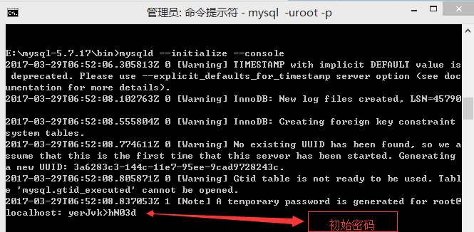 5:输入“mysqld --initialize --console”命令,可以得到mysql的初始密码,用mysqld --initialize 的目的是初始化data目录。要不然mysql5.7的文件夹下面不会出现data文件夹