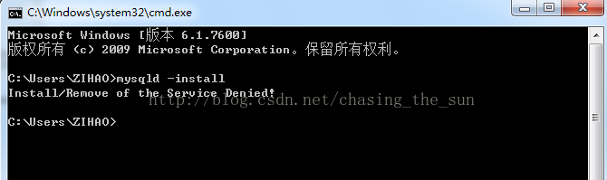 如果直接运行cmd的话,输入mysqld -install时会出现因为权限不够而出现错误:Install/Remove of theService Denied!