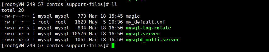 查看support-files文件夹的内容,发现并没有my_default.cnf默认的配置文件,如果没有默认的配置文件,需要手动创建一个my_default.cnf配置文件