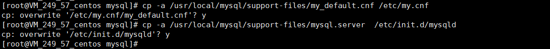 复制上述的my_default.cnf和mysql.server配置文件到etc目录,之前复制过该文件到etc目录,它这里提示是否覆盖,输入Y覆盖