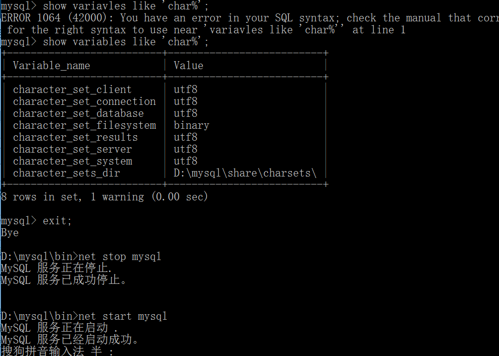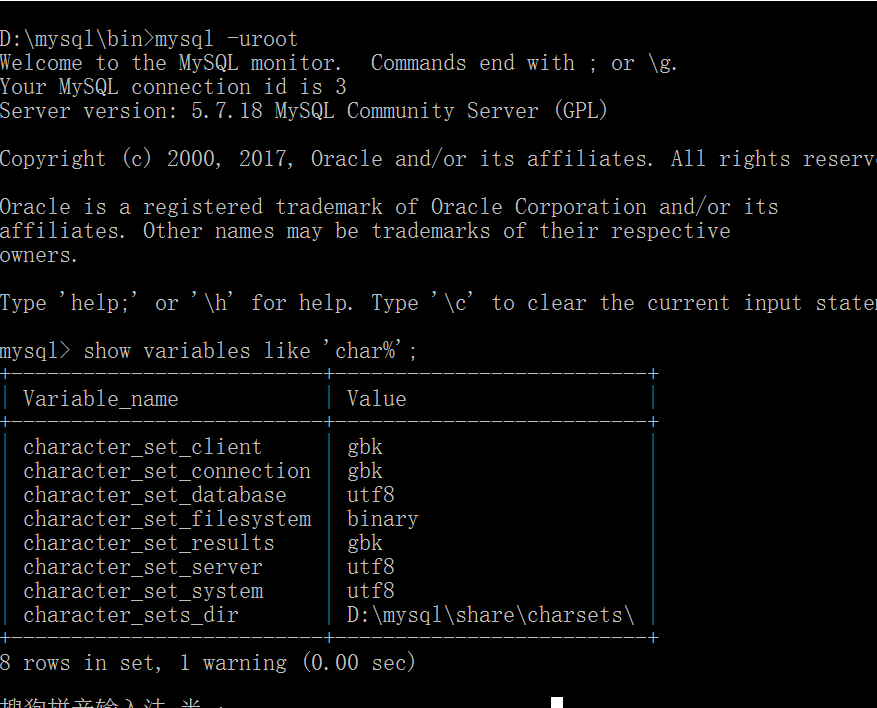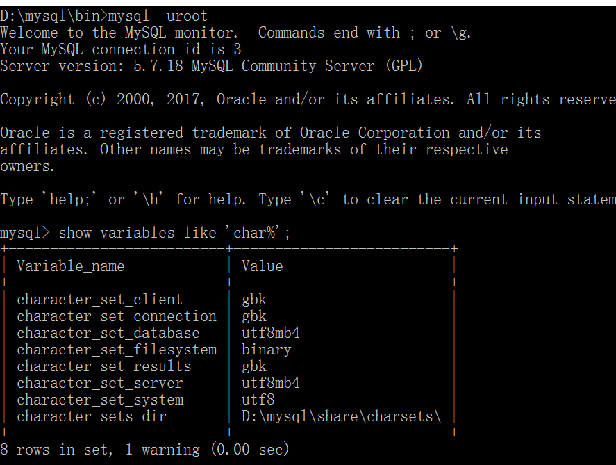 修改字符集首先进入mysql: mysql -uroot (用户登录,因为初始化选了没密码的那种),show variables like 'char%' (查看字符编码),如图: