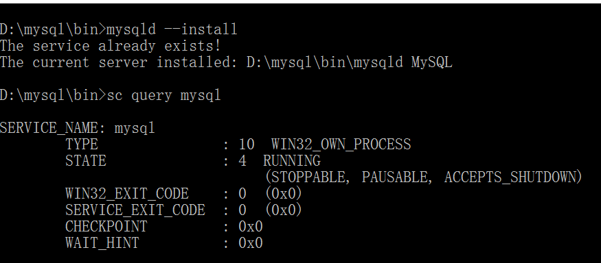 3、查询mysql服务: sc query mysql(也可以在控制面板-管理工具-服务中找到,或直接搜索服务)