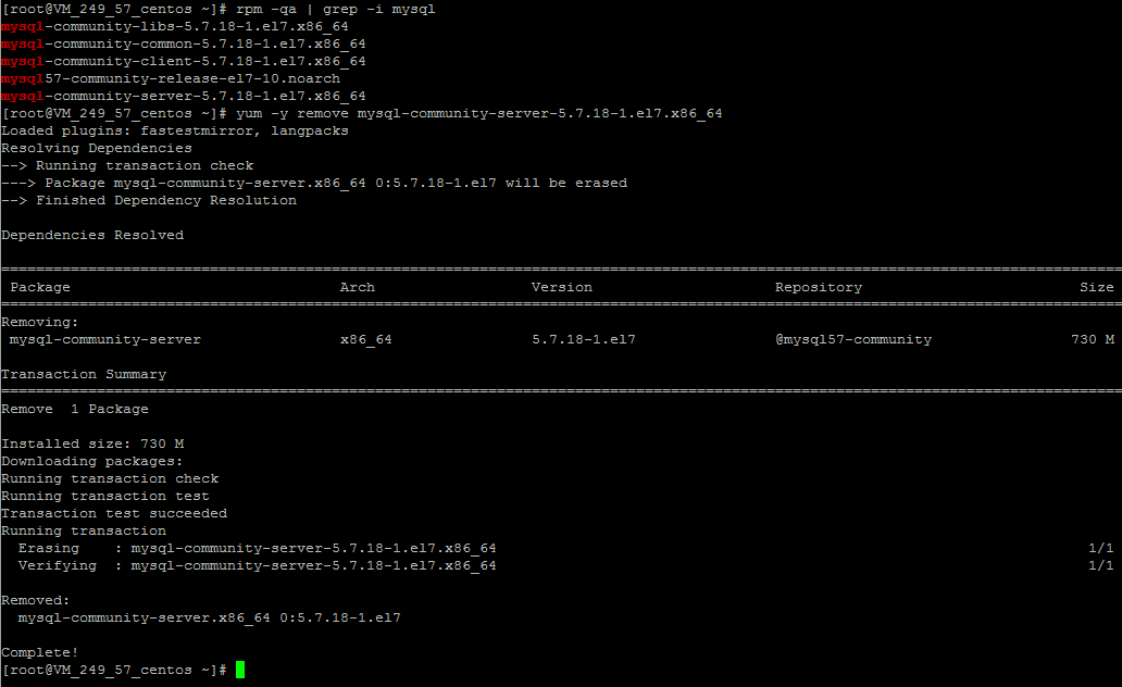 yum -y remove mysql-community-libs-5.7.18-1.el7.x86_64 yum -y remove mysql-community-common-5.7.18-1.el7.x86_64 yum -y remove mysql-community-client-5.7.18-1.el7.x86_64 yum -y remove mysql57-community-release-el7-10.noarch yum -y remove mysql-community-server-5.7.18-1.el7.x86_64