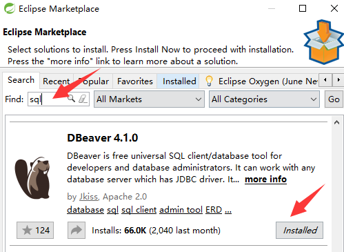 输入sql进行查找,就可以看到DBeaver了,点击Install按钮根据提示安装就好啦