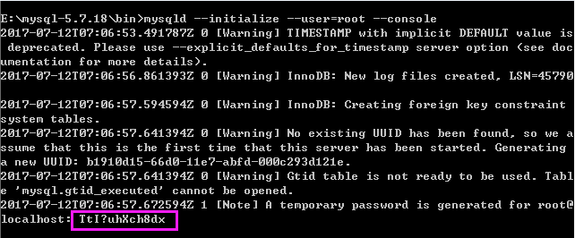 3. 输入以下命令mysqld --initialize --user=root --console,可以初始化MySQL数据库,初始化了之后,会打印出MySQL的默认生成的密码,最下面圈着的就是默认生成的密码。