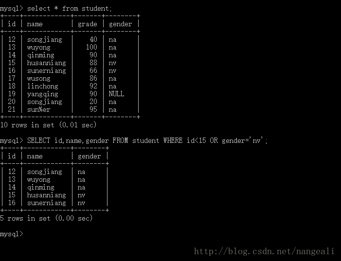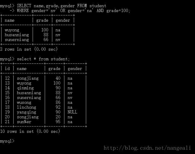 查询student表中,gender字段值为nv,或者gender字段值为na,并且,grade字段值为100的学生姓名