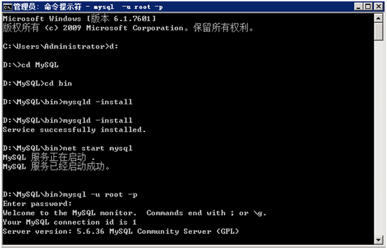 启动服务net start mysql