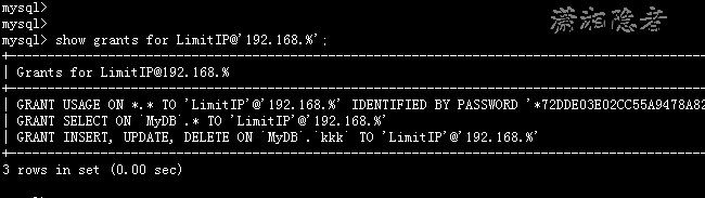 mysql> GRANT SELECT ON MyDB.* TO LimitIP@'192.168.%' IDENTIFIED BY 'LimitIP'; Query OK, 0 rows affected (0.01 sec) mysql> GRANT INSERT ,UPDATE,DELETE ON MyDB.kkk TO LimitIP@'192.168.%'; Query OK, 0 rows affected (0.00 sec) mysql> mysql> flush privileges; Query OK, 0 rows affected (0.00 sec) mysql> mysql> show grants for LimitIP@'192.168.%'; +----------------------------------------------------------------------------------------------------------------+ | Grants for LimitIP@192.168.% | +----------------------------------------------------------------------------------------------------------------+ | GRANT USAGE ON *.* TO 'LimitIP'@'192.168.%' IDENTIFIED BY PASSWORD '*72DDE03E02CC55A9478A82F3F4EBE7F639249DEC' | | GRANT SELECT ON `MyDB`.* TO 'LimitIP'@'192.168.%' | | GRANT INSERT, UPDATE, DELETE ON `MyDB`.`kkk` TO 'LimitIP'@'192.168.%' | +----------------------------------------------------------------------------------------------------------------+ 3 rows in set (0.00 sec) mysql>