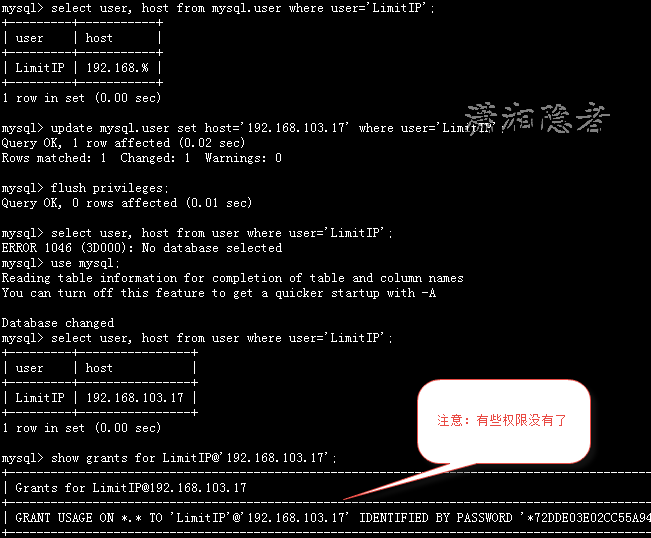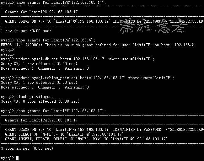 mysql> select user, host from mysql.user where user='LimitIP'; +---------+-----------+ | user | host | +---------+-----------+ | LimitIP | 192.168.% | +---------+-----------+ 1 row in set (0.00 sec) mysql> update mysql.user set host='192.168.103.17' where user='LimitIP'; Query OK, 1 row affected (0.02 sec) Rows matched: 1 Changed: 1 Warnings: 0 mysql> flush privileges; Query OK, 0 rows affected (0.01 sec) mysql> select user, host from user where user='LimitIP'; ERROR 1046 (3D000): No database selected mysql> use mysql; Reading table information for completion of table and column names You can turn off this feature to get a quicker startup with -A Database changed mysql> select user, host from user where user='LimitIP'; +---------+----------------+ | user | host | +---------+----------------+ | LimitIP | 192.168.103.17 | +---------+----------------+ 1 row in set (0.00 sec) mysql> show grants for LimitIP@'192.168.103.17'; +---------------------------------------------------------------------------------------------------------------------+ | Grants for LimitIP@192.168.103.17 | +---------------------------------------------------------------------------------------------------------------------+ | GRANT USAGE ON *.* TO 'LimitIP'@'192.168.103.17' IDENTIFIED BY PASSWORD '*72DDE03E02CC55A9478A82F3F4EBE7F639249DEC' | +---------------------------------------------------------------------------------------------------------------------+ 1 row in set (0.00 sec) mysql>