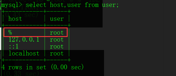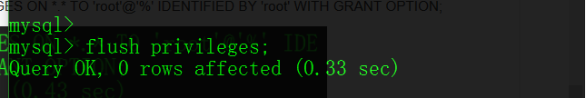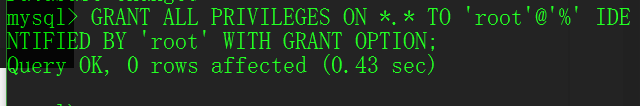 然后执行修改权限的命令:GRANT ALL PRIVILEGES ON *.* TO 'root'@'%' IDENTIFIED BY 'root' WITH GRANT OPTION;