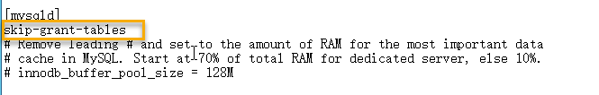 如下图,打开配置文件my.ini 在mysqld下面添加 skip-grant-tables,保存退出,并重启mysql服务。