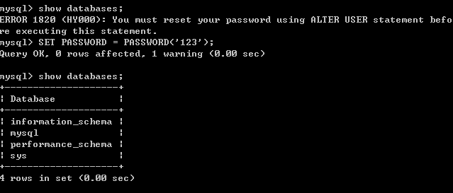 值得注意的是,重新进入数据库可能会遇到1820错误,要求重置密码,如下图,这个时候,只需要执行命令 SET PASSWORD = PASSWORD('123'); 即可