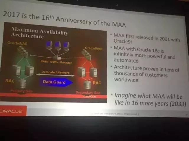 关于Oracle和MySQL的高可用方案,其实一直想要总结了,就会分为几个系列来简单说说。通过这样的对比,会对两种数据库架构设计上的细节差异有一个基本的认识。Oracle有一套很成熟的解决方案。用我在OOW上的ppt来看,是MAA的方案,今年是这个方案的16周年了。