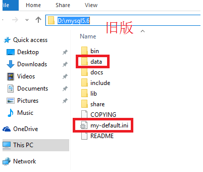 对比一下下图5.6以前的版本,少data目录(存放数据)和my-default.ini文件(配置信息)