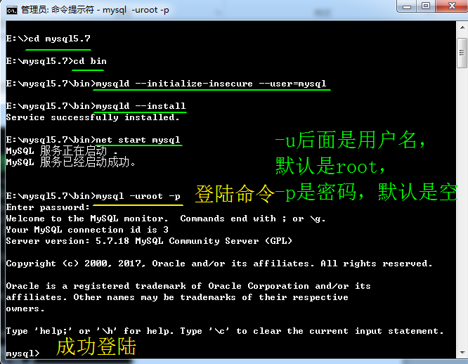 3、运行net start mysql 启动服务,如下图