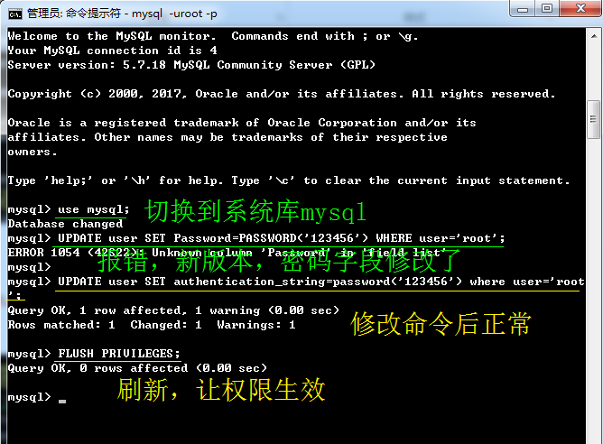 UPDATE user SET authentication_string=password('123456') where user='root';