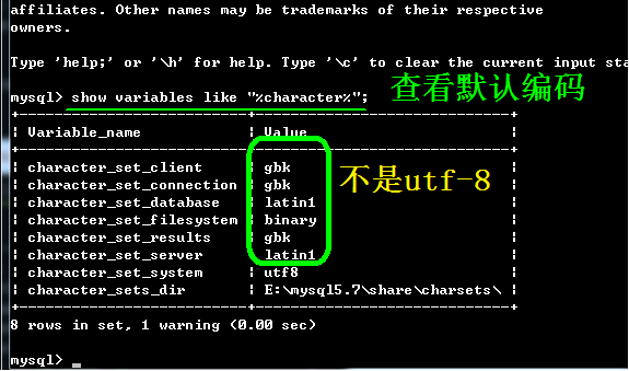 3、运行命令show variables like "%character%"查看系统字符集变量,如下图: