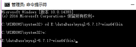 将文件目录切换到E:\dataBase\mysql-5.7.17-winx64\bin(该路径取决于你安装的位置)目录下。