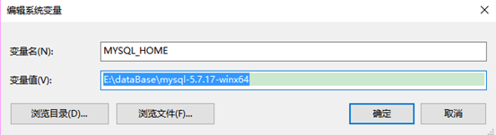 在系统环境变量中"新建"一个名为"MYSQL_HOME"的变量。变量值:"E:\dataBase\mysql-5.7.17-winx64"
