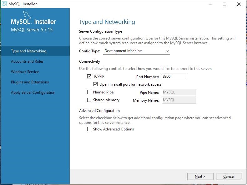 cofig type 选择development machine,设置协议,端口相关内容,next