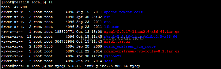 (2)执行命令:mv mysql-5.6.16-linux-glibc2.5-x86_64 mysql重命名解压后的文价夹为mysql