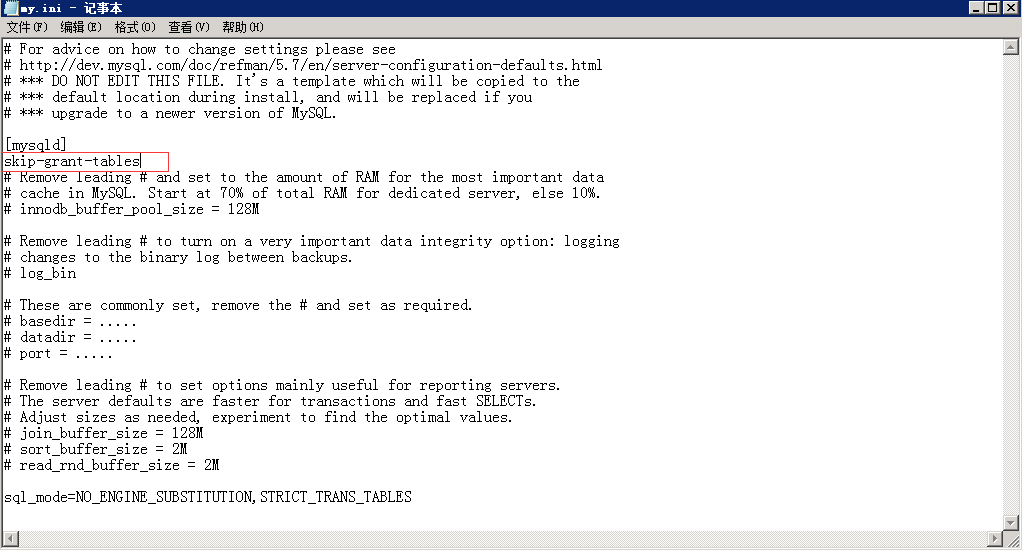 第四步:修改my.ini 文件,在[mysqld]下添加一行skip-grant-tables,然后依次执行