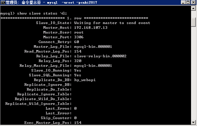 设置权限:change master to master_host='192.168.107.13',master_user='root',master_password='cnki2017',master_log_file='mysql-bin.000001',master_log_pos=154;