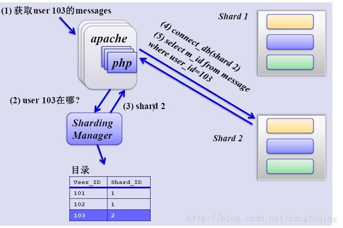 如何来确定某个用户所在的shard呢,可以建一张用户和shard对应的数据表,每次请求先从这张表找用户的shard id,再从对应shard中查询相关数据,如下图所示: