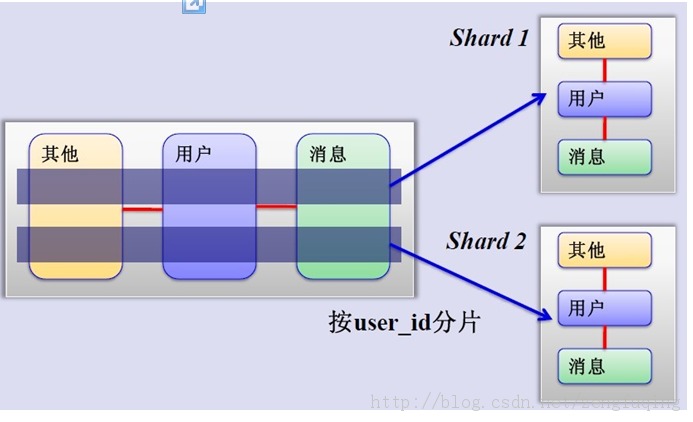 这是一个非常好的思路,将用户按一定规则(按id哈希)分组,并把该组用户的数据存储到一个数据库分片中,即一个sharding,这样随着用户数量的增加,只要简单地配置一台服务器即可,原理图如下: