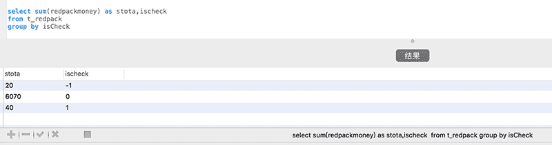 select sum(redpackmoney) as stota,ischeck from t_redpack group by isCheck