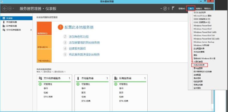 在Windows Server2012中,我们进入服务器管理面板,点击右上角菜单栏中的“工具”,选择其中的“任务计划程序”: