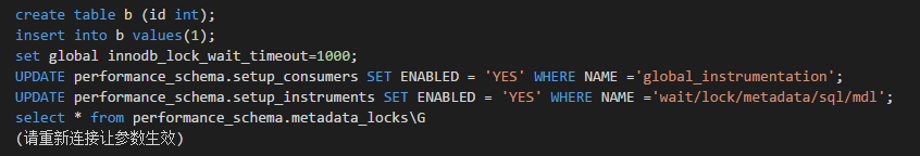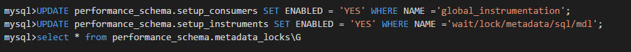 方式二:处于堵塞情况下使用5.7版本的performance_schema.metadata_locks观察。