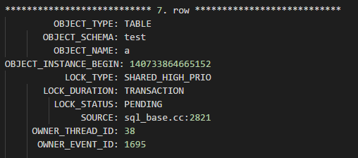 这里比较遗憾在performance_schema.metadata_locks中并没有显示出MDL_EXCLUSIVE(X),而显示为MDL_SHARED(S)是我们在我输出的日志中可以看到这里做了升级操作将MDL_SHARED(S) 升级为了MDL_EXCLUSIVE(X)。并且由前面的兼容性列表来看,只有MDL_EXCLUSIVE(X)会堵塞MDL_SHARED_HIGH_PRIO(SH)。所以我们应该能够确认这里确实做了升级操作,否则SHOW TABLE STATUS[like 'A'] 是不会被堵塞的。