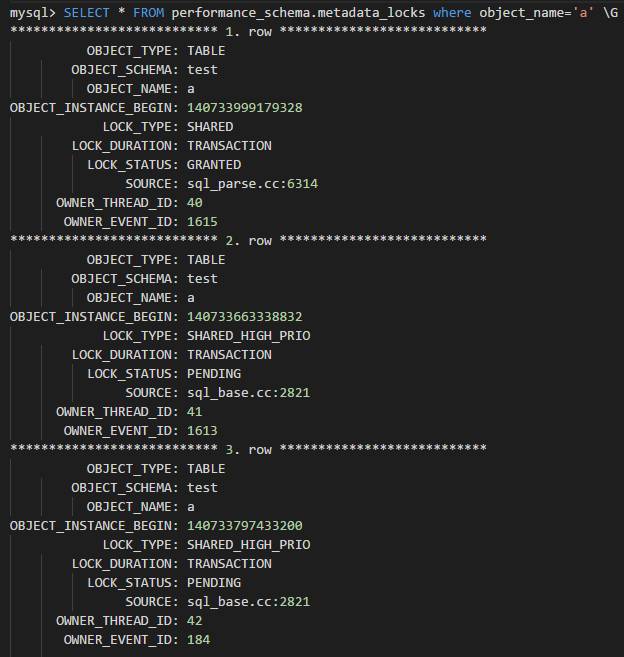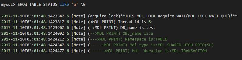 这一点也是我以前不知道的,也是本案列中花时间最多的地方,前文已经分析过要让SHOW TABLE STATUS[like 'A']这种只会上MDL_SHARED_HIGH_PRIO(SH) MDL LOCK的语句堵塞在MDL LOCK上只有一种可能那就是A表上了MDL_EXCLUSIVE(X)。