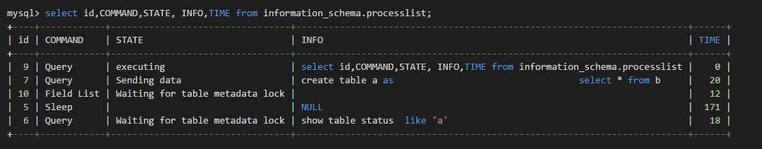 因为CRATE TABLE A AS SELECT B在A表建立完成之前会上MDL_EXCLUSIVE(X),这把锁会堵塞其他全部的关于A表的语句,包括DESC/SHOW TABLE STATUS/USE DB(非-A) 这种只上MDL_SHARED_HIGH_PRIO(SH)MDL LOCK 的语句。STATE统一为Waiting for table metadata lock。
