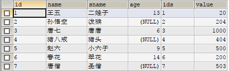 SELECT * FROM (SELECT * FROM table_a a INNER JOIN table_b b ON a.id=b.ids UNION ALL SELECT 8 id,'白龙马' `name`,'小白' sname,'1000' age ,8 ids, 27 `value` UNION ALL SELECT 9 id,'沙悟净' `name`,'卷帘将军' sname,'2000' age ,9 ids, 289 `value` )A