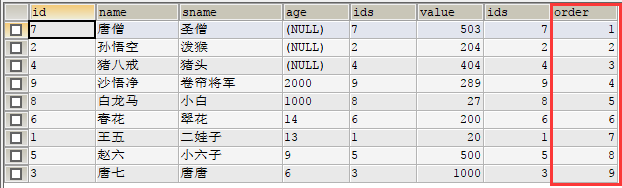SELECT * FROM (SELECT * FROM table_a a INNER JOIN table_b b ON a.id=b.ids UNION ALL SELECT 8 id,'白龙马' `name`,'小白' sname,'1000' age ,8 ids, 27 `value` UNION ALL SELECT 9 id,'沙悟净' `name`,'卷帘将军' sname,'2000' age ,9 ids, 289 `value`)A INNER JOIN (SELECT 7 ids, 1`order` UNION ALL SELECT 2 ids, 2`order` UNION ALL SELECT 4 ids, 3`order` UNION ALL SELECT 9 ids, 4`order` UNION ALL SELECT 8 ids, 5`order` UNION ALL SELECT 6 ids, 6`order` UNION ALL SELECT 1 ids, 7`order` UNION ALL SELECT 5 ids, 8`order` UNION ALL SELECT 3 ids, 9`order` ) B ON B.ids=A.id ORDER BY B.order